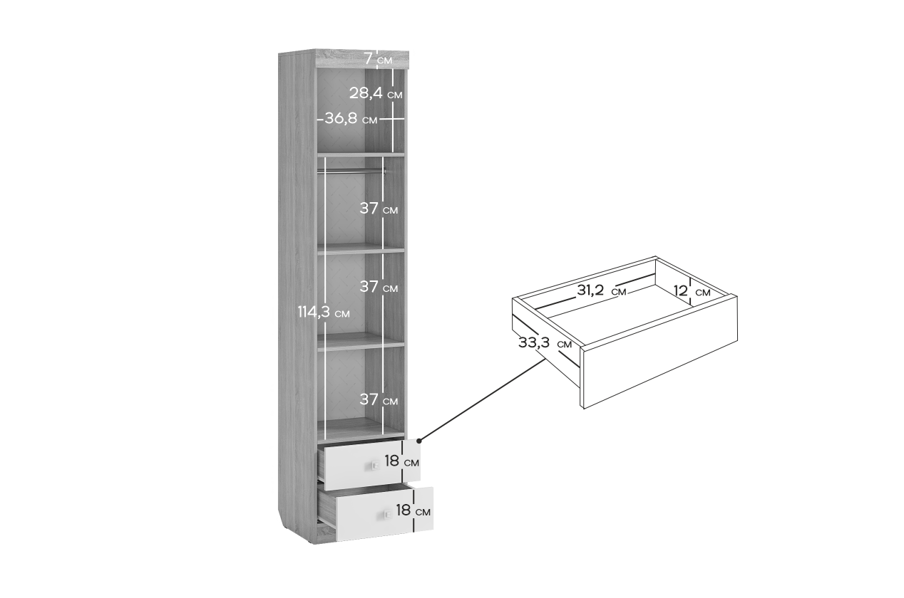 Детский шкаф 1-створчатый Форсаж - это идеальное сочетание элегантности и удобства. Он не только украсит детскую комнату, но и поможет в организации пространства. Штанга из металла и выдвижные ящики предоставляют массу возможностей для хранения одежды, игрушек и других детских вещей. Специальный вырез под плинтус делает эту модель еще более практичной.