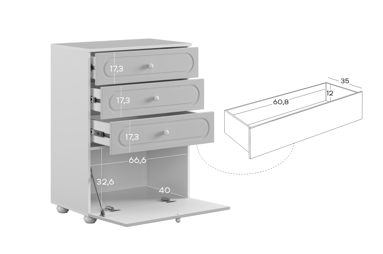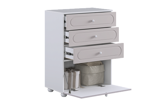 Комод оснащён тремя выкатными ящиками на шариковых направляющих, обеспечивающими плавный и надёжный ход. Ящики подойдут для хранения одежды, белья, аксессуаров или игрушек. В нижней части расположена вместительная откидная секция, предназначенная для более габаритных предметов и сезонных вещей.