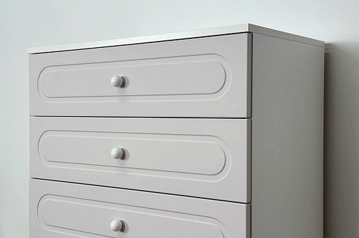 Корпус комода выполнен из ЛДСП толщиной 16 мм, фасады изготовлены из МДФ в плёнке ПВХ. Фасады с фрезеровкой подчёркивают аккуратный внешний вид изделия. Оригинальные круглые ручки и опоры придают комоду современный и лёгкий характер, делая его гармоничной частью детского интерьера.