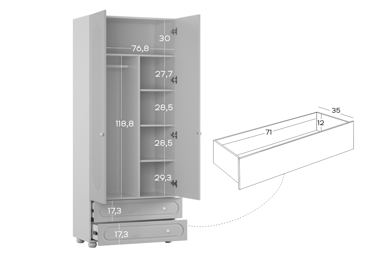 Слева внутри шкафа расположена штанга для плечиков, предназначенная для хранения одежды на вешалках. Правая часть оборудована полками, которые подойдут для аккуратного размещения сложенной одежды, коробок или аксессуаров. В нижней части предусмотрены два вместительных выкатных ящика для хранения, обеспечивающих дополнительное место для вещей повседневного использования.