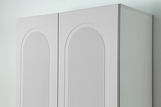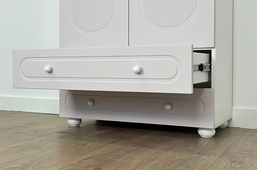 Корпус шкафа выполнен из ЛДСП толщиной 16 мм, фасады изготовлены из МДФ в плёнке ПВХ и декорированы фрезеровкой, подчёркивающей стиль серии Милана. Оригинальные круглые ручки и опоры придают шкафу аккуратный и современный вид, делая его гармоничной частью детского интерьера.
