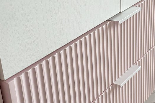 Шкаф изготовлен из ЛДСП в белом цвете, что придаст помещению светлую и уютную атмосферу. Фасады распашных дверей выполнены из ЛДСП в цвете белое дерево. Фасады выкатных ящиков выполнены из МДФ, покрытие эмаль. Вертикальные полосы на фасаде создают особую изысканность и стильный акцент, добавляя глубины пространству.
