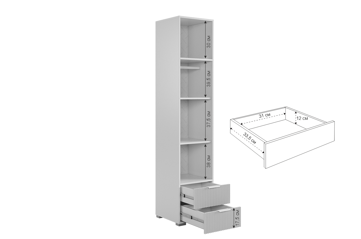 Шкаф изготовлен из прочного материала – ЛДСП в цвете белое дерево. Фасад распашной двери выполнены из ЛДСП в цвете белое дерево. Фасады выкатных ящиков выполнены из качественного МДФ с использованием эмали. Вертикальные полосы на фасаде - фрезеровка, которая создает эффектный акцент.
