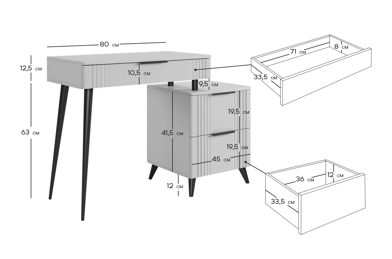 Благодаря своему дизайну трюмо «Катрин» легко впишется в любой интерьер и гармонично сочетается с другими модулями спальни «Катрин». Выкатные ящики предоставляют достаточно места для хранения различных предметов, а возможность использования трюмо в качестве письменного стола делает его универсальным элементом мебели.