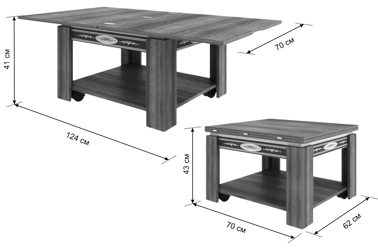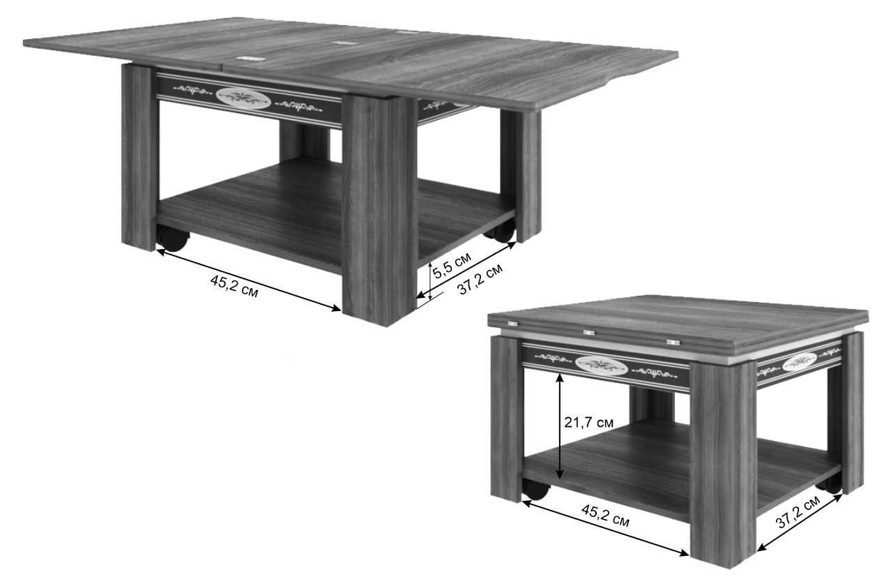 Журнальный столик Адам: Элегантный столик, который идеально подойдет для дополнения как классического, так и современного интерьера вашей гостиной или спальни. Изящный рисунок на царге делает его уникальным и выделяющимся. Особенность этой модели - поворотно-раскладной механизм, благодаря которому вы быстро и легко сервируете стол для гостей. Дополнительная полка внизу предназначена для различных мелочей, а удобные колесики позволяют легко перемещать стол по комнате. Принтерная печать использовалась для нанесения рисунка на поверхность стола.