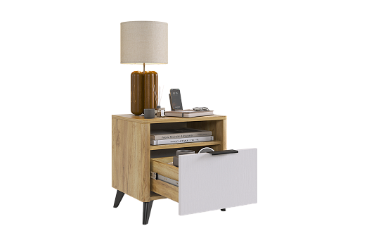 В выдвижном ящике на шариковых направляющих поместятся все необходимые вещи, а на открытой полке телефон, очки, книги и другие приятные мелочи.