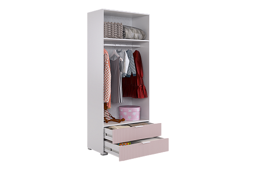 - Внутри шкафа вы найдете штангу для одежды, полки.А также два удобных ящика с шариковыми направляющими.