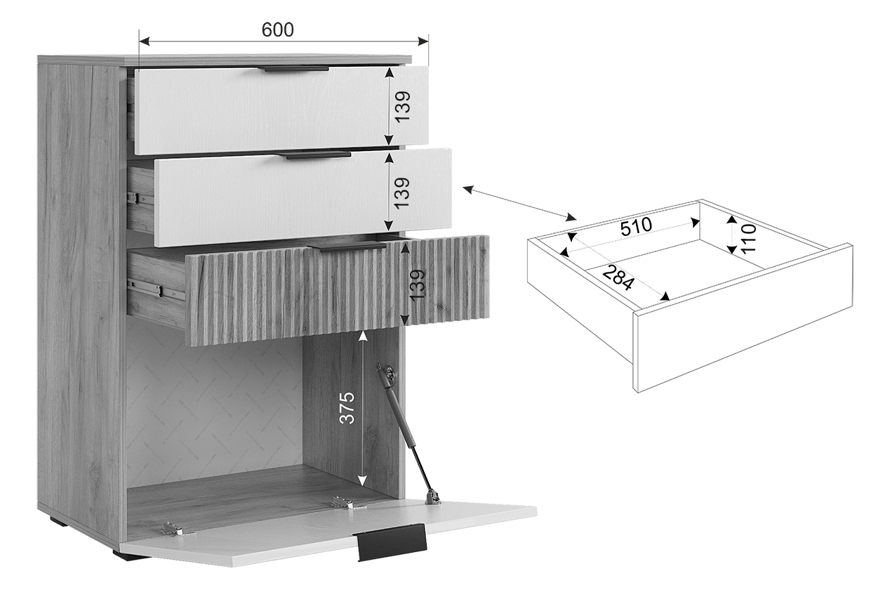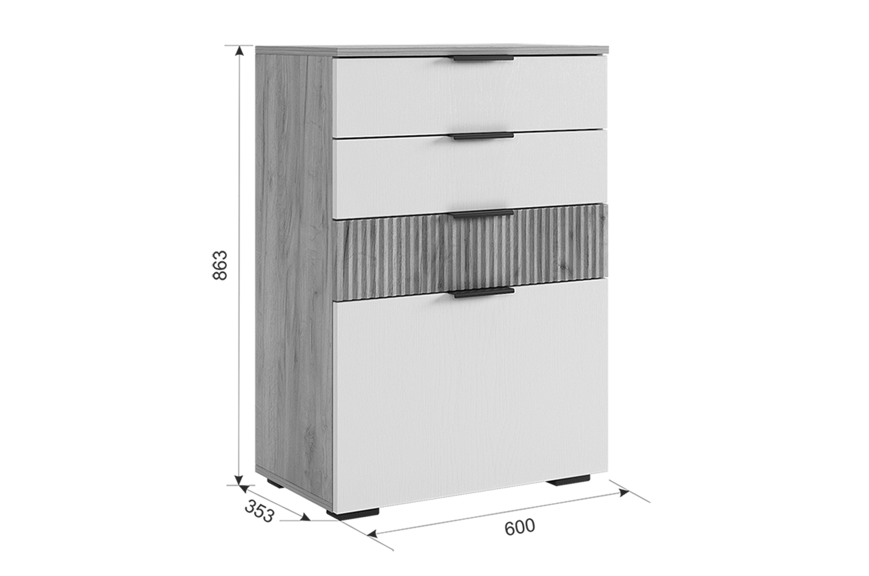Акцентом в комоде будет МДФ фасад ящика с вертикальной фрезеровкой "Вельвет". Ящики возможно расположить в любой последовательности.