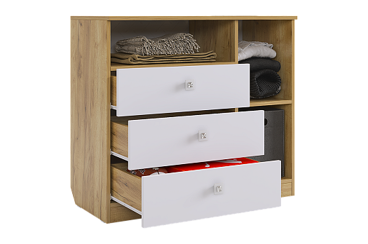 Детский комод Форсаж сочетает в себе стиль и практичность, идеально вписываясь в современный интерьер детской комнаты. Этот комод предлагает достаточно пространства для хранения с ящиками и полками за дверцей, где можно аккуратно разместить детские вещи. На верхней открытой полке удобно хранить игровые приставки, в то время как просторная столешница предназначена для установки телевизора.