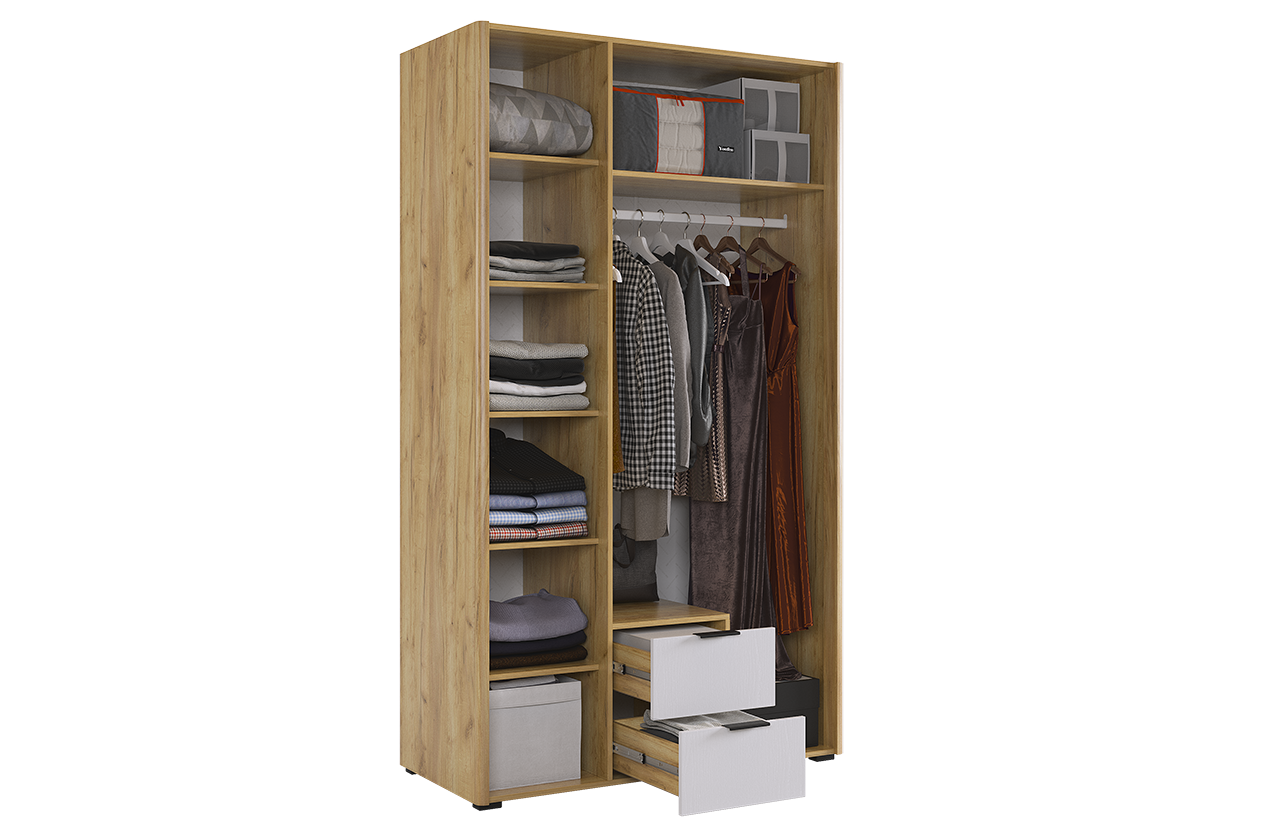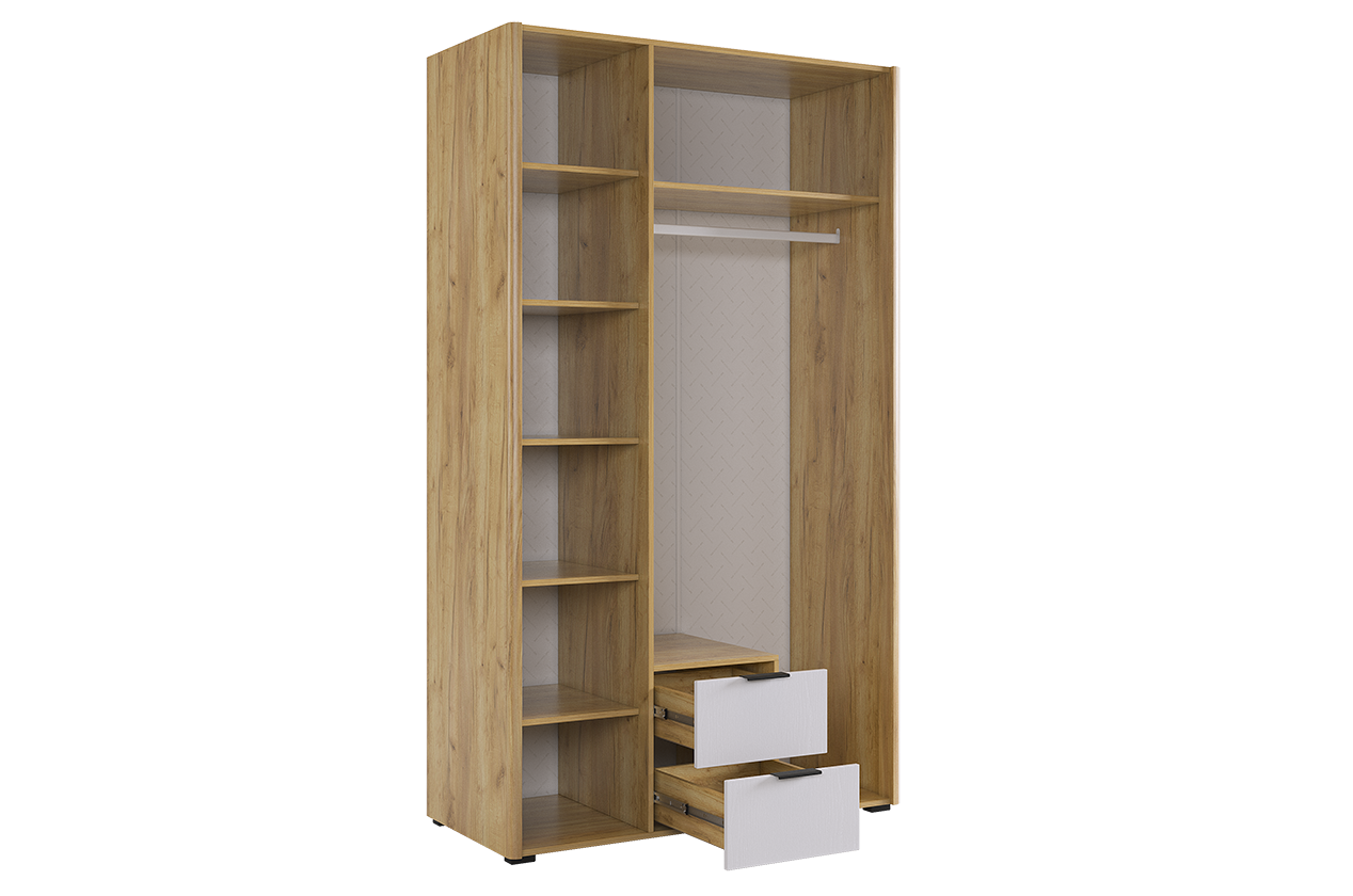 Вместительный шкаф имеет полки, ящики выдвижные и штангу для одежды, а полукруглые, обтекаемые углы обеспечат безопасность и комфорт.