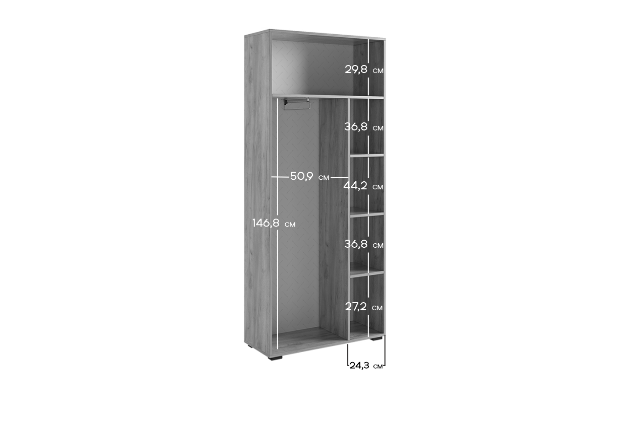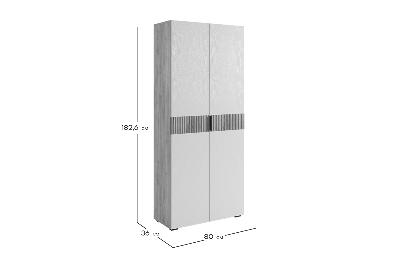 Шкаф Бери предлагает отличное решение для аккуратного хранения вашего гардероба. Он идеально дополнит современный интерьер благодаря своему дизайну и функциональности. Внутри шкафа имеется вместительное отделение с выдвижной штангой для одежды на вешалках, несколько полок для сложенных вещей и антресольная ниша для сезонных вещей. Вставки на фасадах, выполненные с вертикальной фрезеровкой, делают эту модель по-настоящему уникальной.