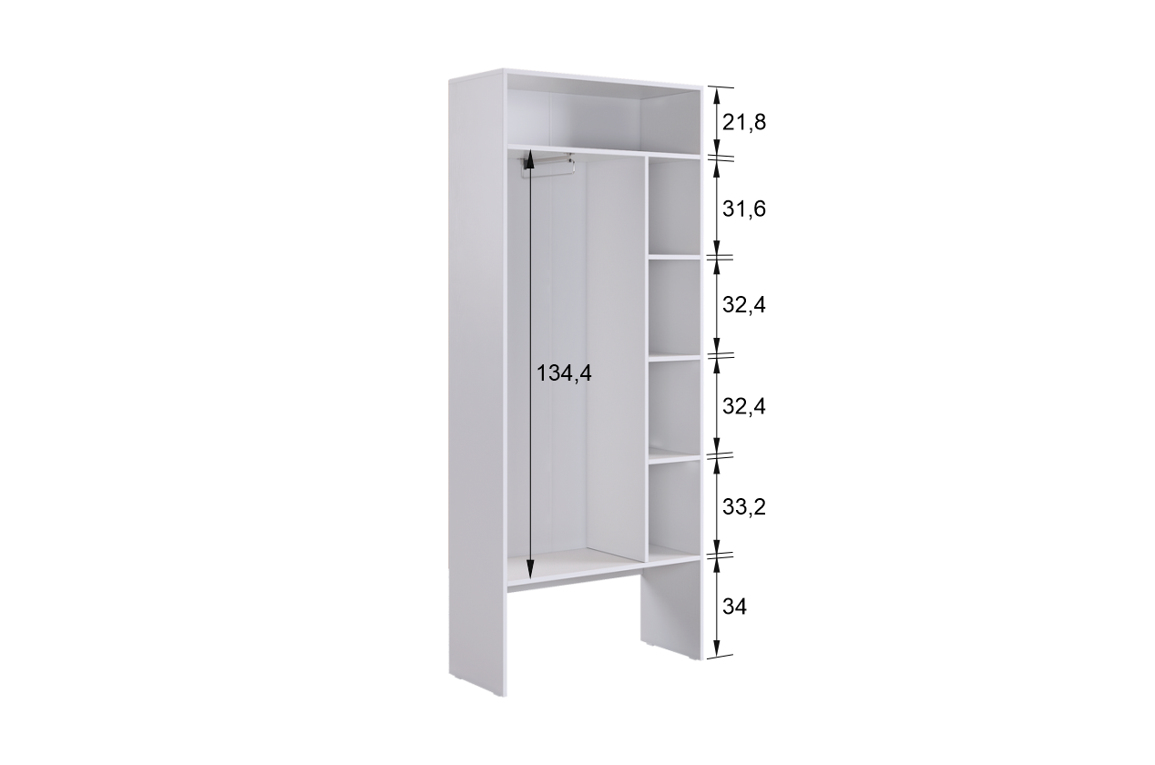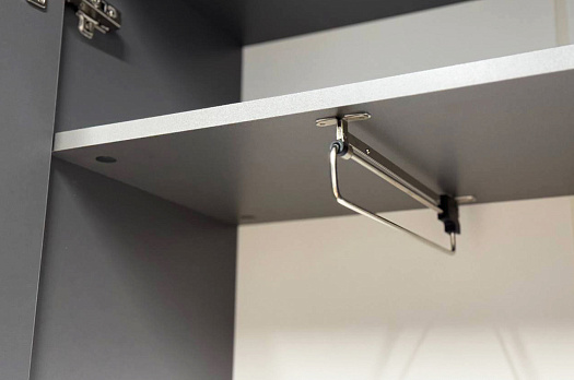 Шкаф оснащен накладными петлями с доводчиком от Боярд, которые обеспечивают плавное и бесшумное закрывание дверей. Выдвижная штанга и отделение с полками предоставляют удобный доступ к одежде, позволяя легко организовать внутреннее пространство.