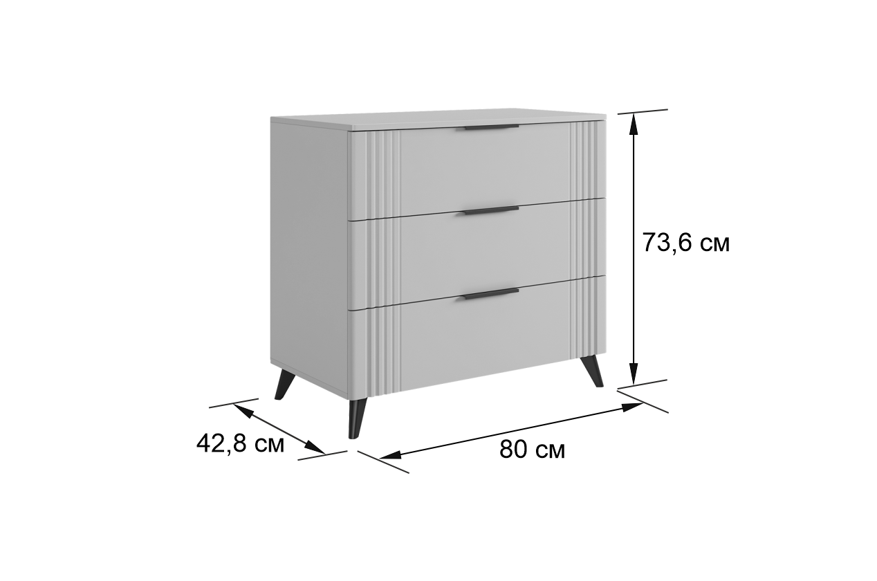 Комод изготовлен из качественных материалов: корпус выполнен из ЛДСП, что гарантирует прочность и долговечность, а фасад, выполненный из МДФ в плёнке ПВХ, не только выглядит эстетично, но и защищает комод от повреждений. Особое внимание заслуживает фрезеровка фасадов, которая придаёт изделию изысканный вид.