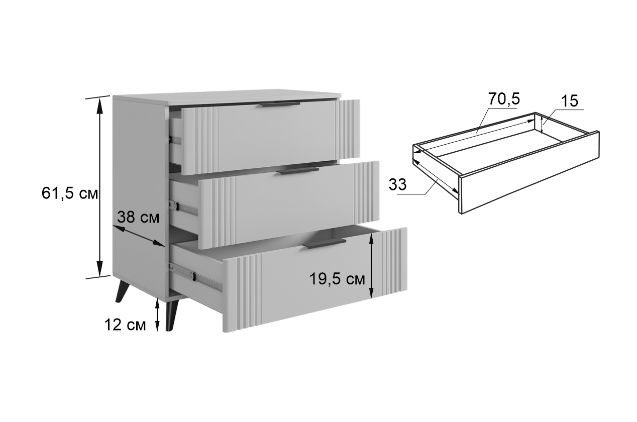Стильные ручки и выкатные ящики на шариковых направляющих обеспечивают удобный доступ к вещам. Нерегулируемые пластиковые опоры гарантируют стабильность конструкции.