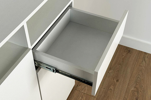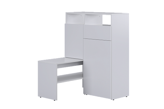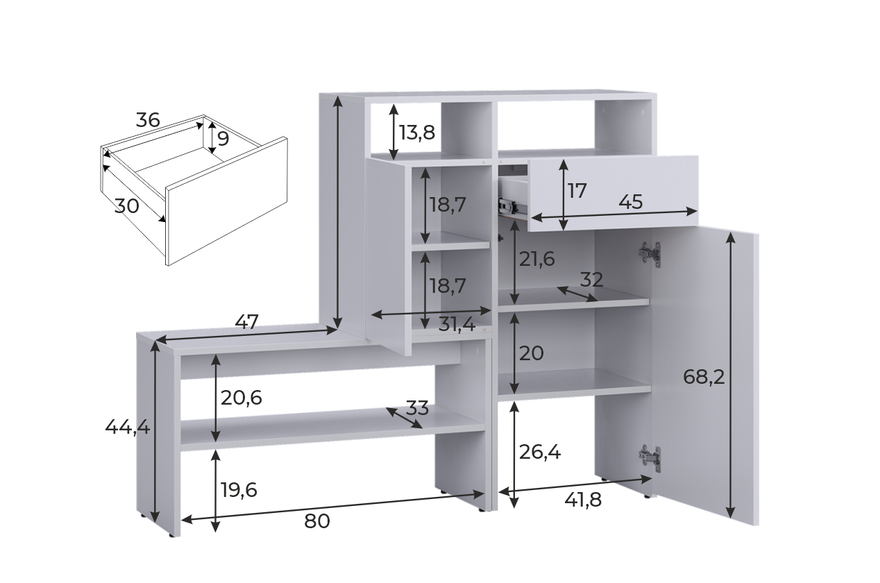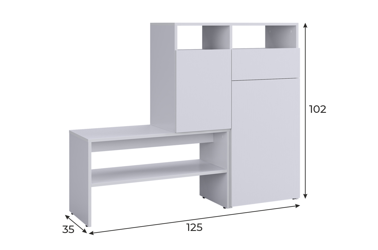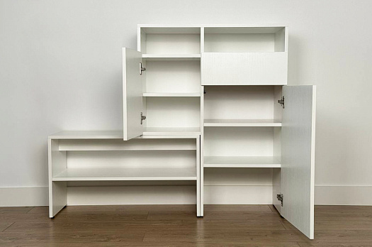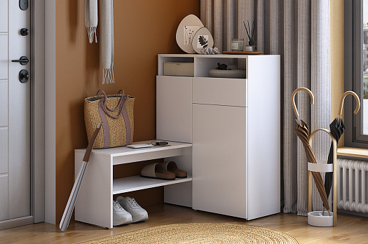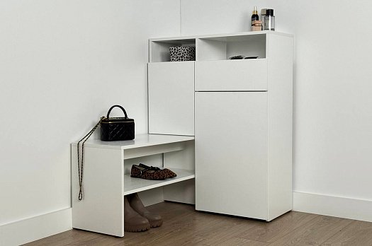 Модель выполнена из ЛДСП толщиной 16 мм и состоит из двух частей: тумбы с распашными дверцами и выкатным ящиком, а также приставной секции-скамеечки. Закрытые полки обеспечат надёжное хранение вещей, а выкатной ящик и скамеечка добавят удобства в использовании.